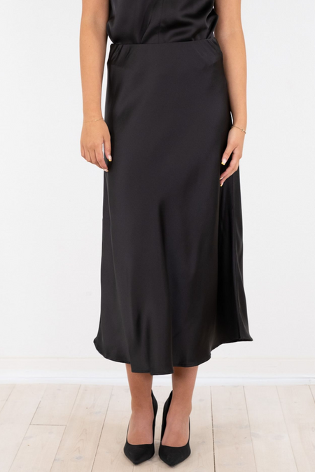Long skirt with elastic inside at waist. The skirt is bias cut and has a very flattering fit. The quality is a nice smooth sateen.