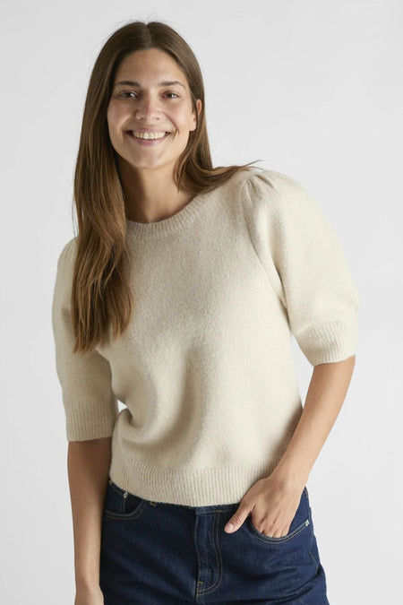 Martha Bow Knit Tee fra Neo Noir. Søt, kortermet strikkegenser fra Neo Noir i ullblanding. Martha Bow Knit Tee har korte puffermer, rett passform og dyp utringning i ryggen med sløyfebånd.