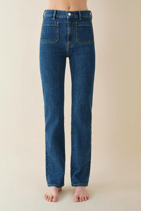 AW014 Alta fra Jeanerica. Alta er et par jeans med høy midje og rette ben, med påsydde lommer med referanser til 1970-tallet. Den har glidelåsgylf, høy midje og smale lår som faller ned til rette ben. Laget i ufarget kremhvit økologisk denim, med Jeanericas signaturstretch-komposisjon som beriker jeansen med varig fleksibilitet.