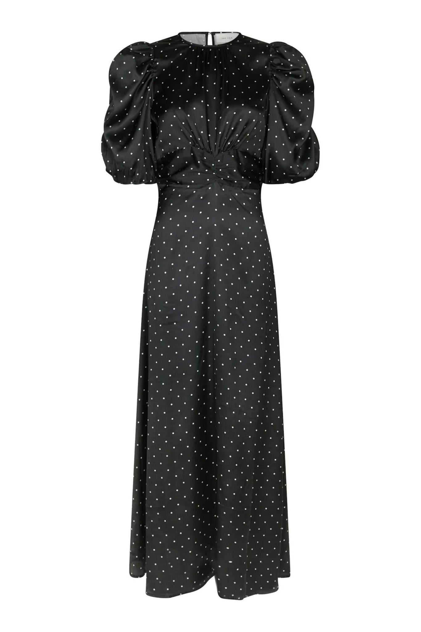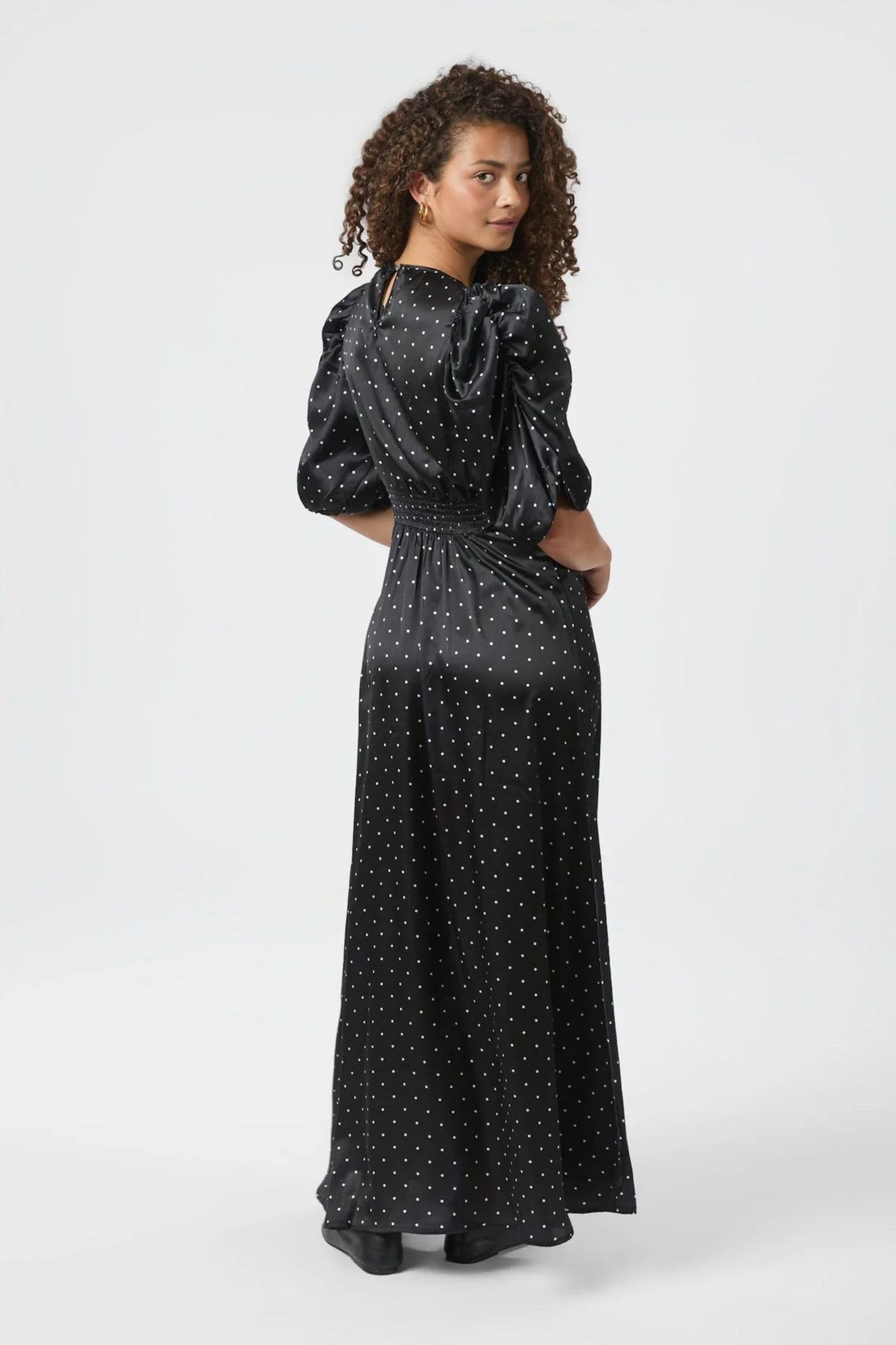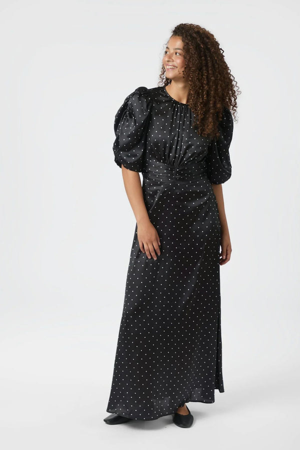 Kikka Dot Dress fra Neo Noir. Denne prikkete kjolen er laget i en lett, satengaktig kvalitet som faller vakkert langs kroppen. Den har flatterende drapering i midjen og puffede ermer med volum som gir en feminin silhuett. Det svarte stoffet er prydet med små hvite prikker som gir et klassisk, men lekent uttrykk. Med sin maxilengde og innsvingte fasong passer den perfekt til alt fra middager til sommerfester.