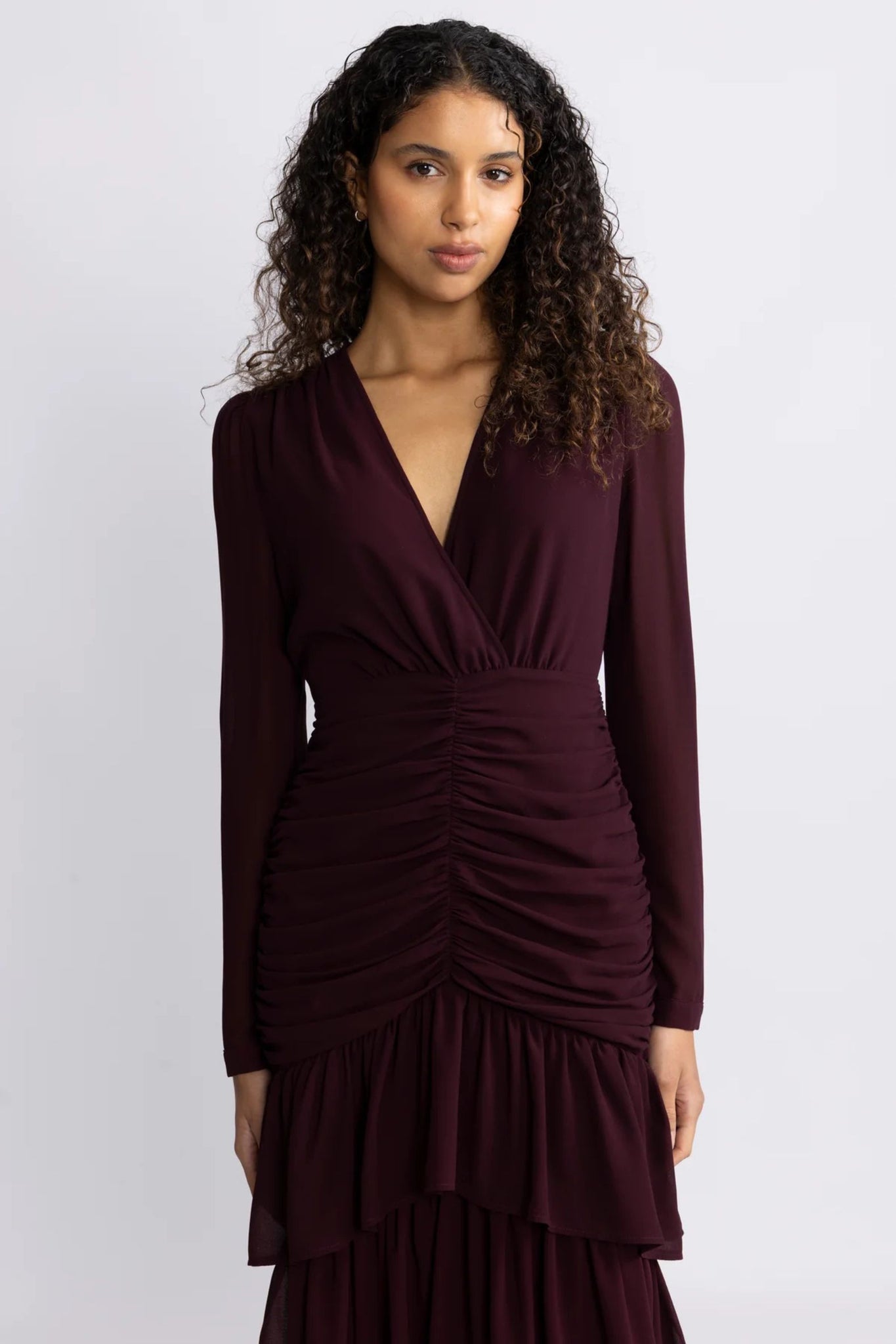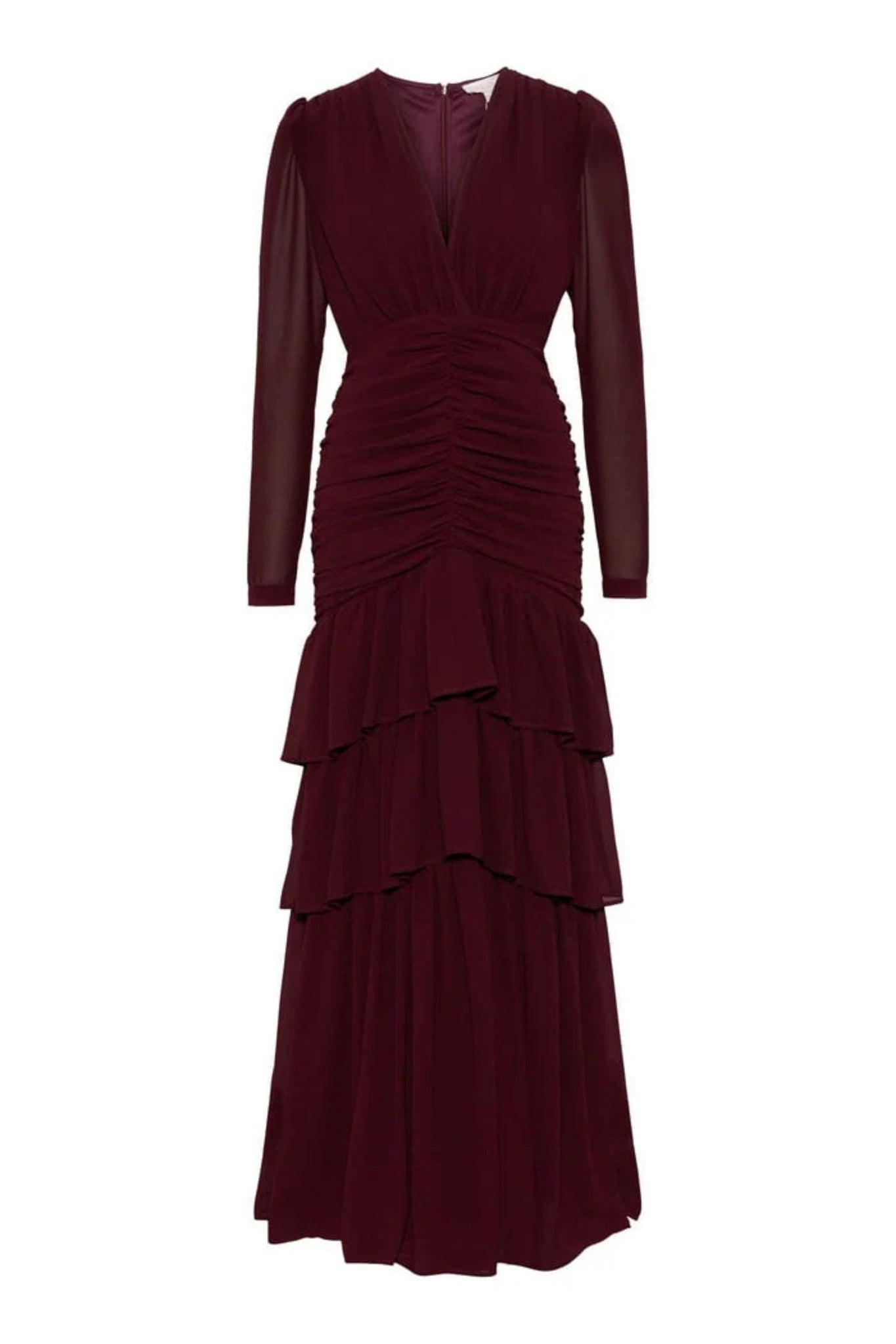 Jenna Maxi Dress fra Love Lolina. Elegant maxikjole fra Love Lolina. Jenna Maxi Dress kombinerer et flatterende snitt med dramatisk volum. Den dype burgunderfargen og de lange, semitransparente ermene gir kjolen et eksklusivt uttrykk, mens det smale, rynkede midjepartiet fremhever silhuetten. Skjørtet faller i flere voluminøse lag som skaper bevegelse og dybde i plagget.